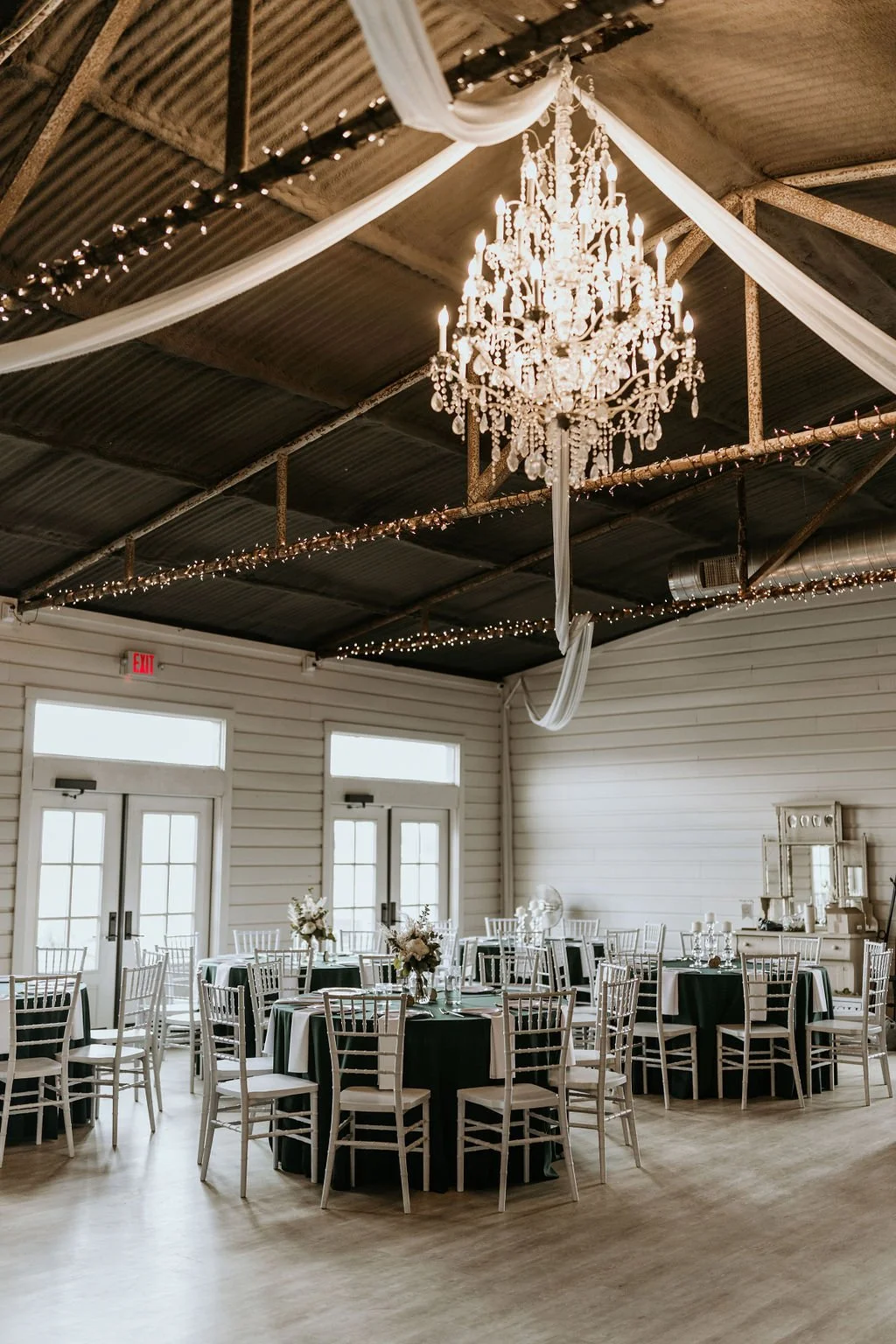 The reception barn at Flying V Ranch is the original auction barn, steeped in true Texas heritage. With its southern white ship lap walls, wood floors, original industrial beams, it exudes rustic charm. A striking chandelier adds a touch of elegance to this unmatched Texas setting.